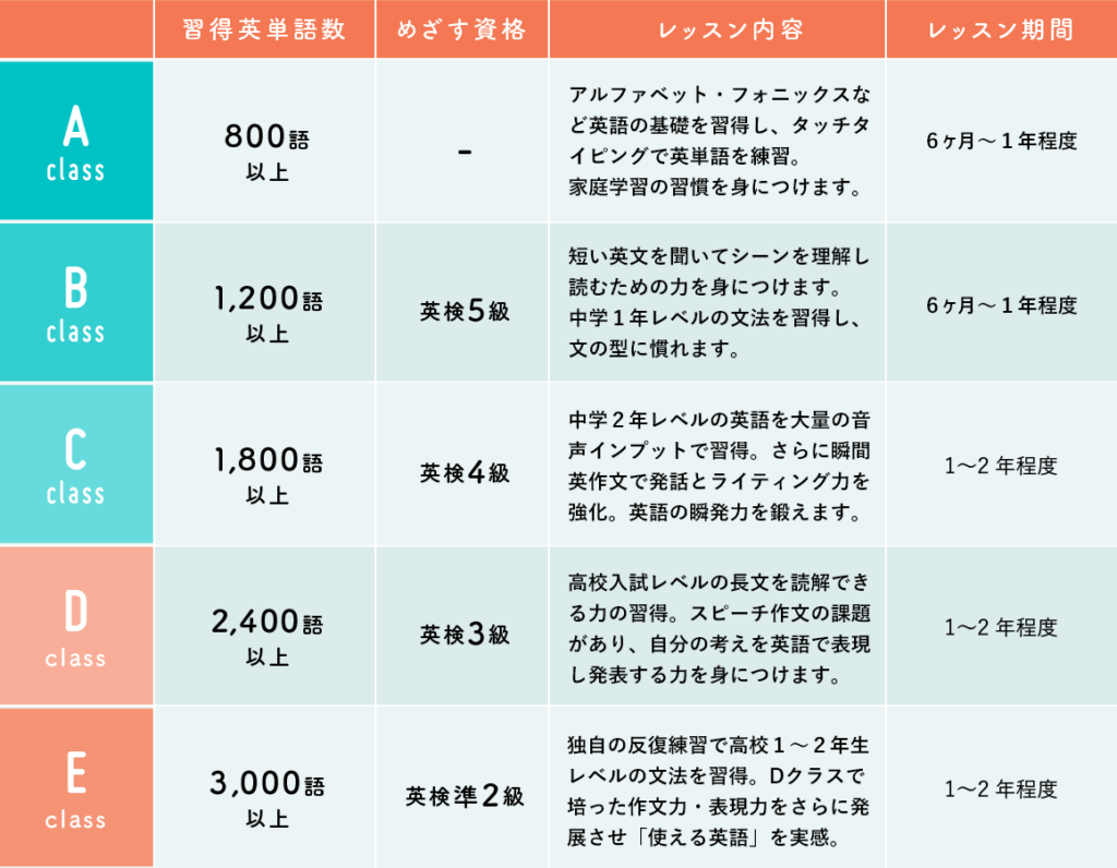 アクティメソッドでは、英語の習熟度に合わせたクラス分けによって、着実に英語の力を身につけながらステップアップができます。