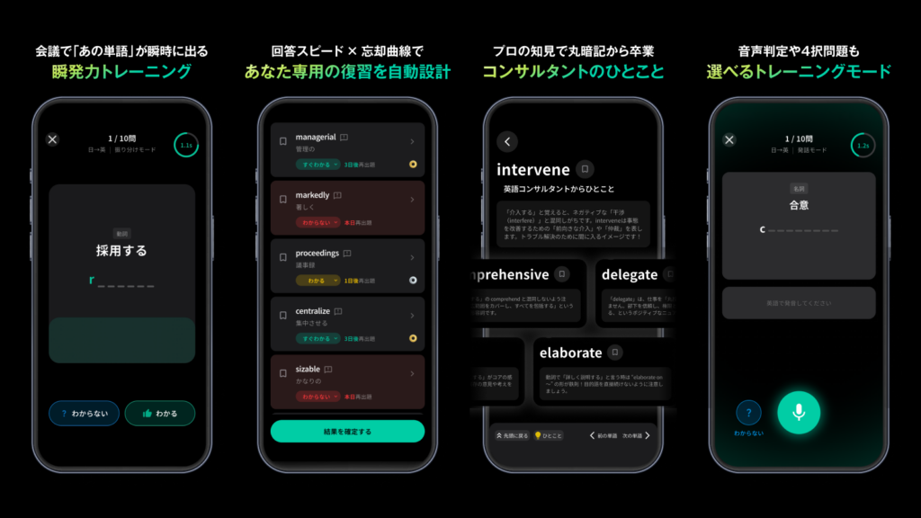 プロワーズ(ProWords)は累計25,000名以上の英語コーチング実績からプログリットが独自で開発した英語学習アプリです。特徴の1つは表示された英単語を「すぐわかる」「わかる」「わからない」の3段階判定で、回答スピードを鍛える瞬発力トレーニングが備わっています。